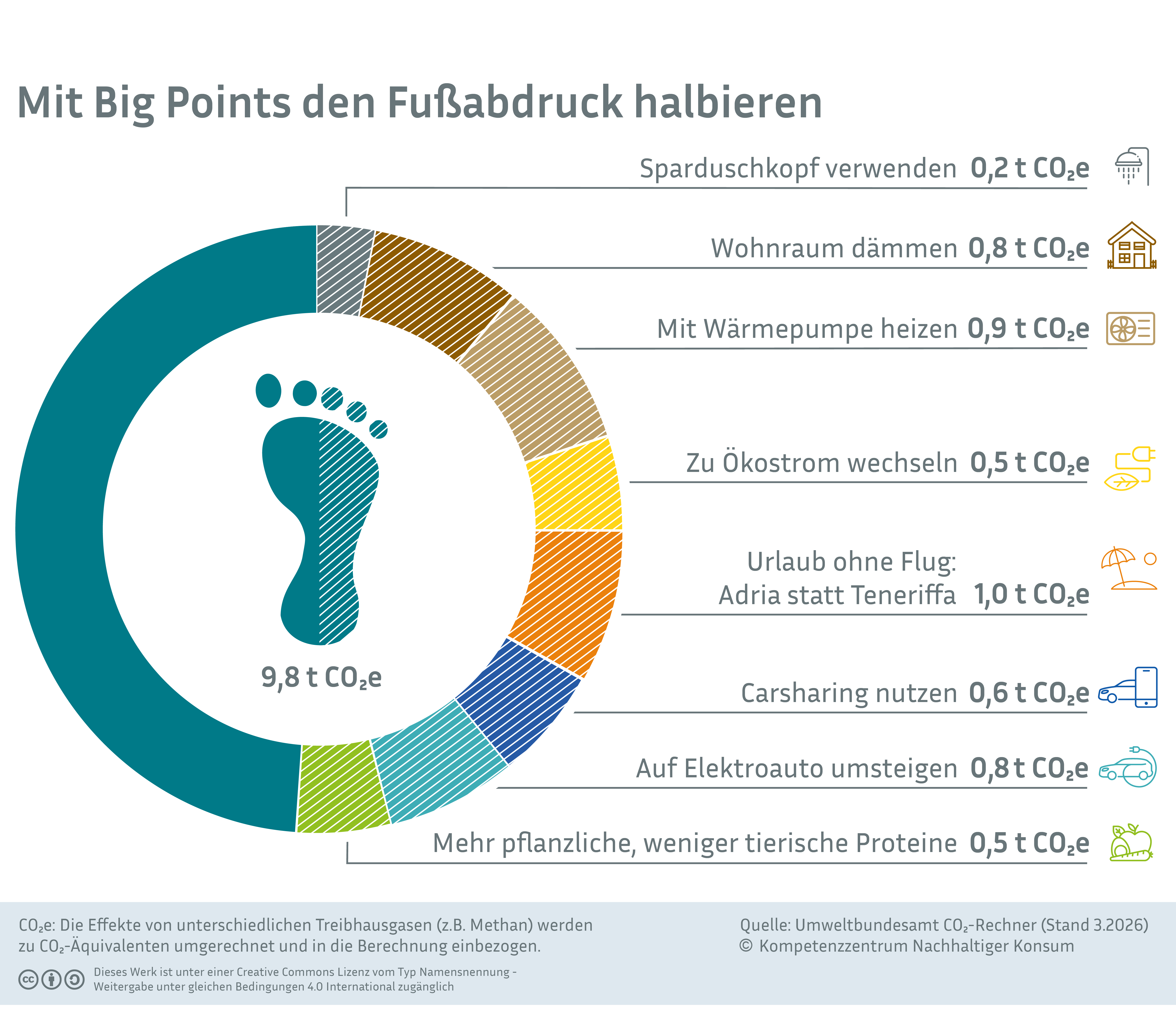Der Blick auf die Big Points, die zentralen Stellschrauben eines nachhaltigen Konsums, ist deshalb für effektives Handeln zwingend: Energieerzeugung, Heizung und Warmwasser, Auto und Flugreisen sowie der Konsum tierischer Produkte. Dazu gehören auch Themen des sogenannten Handabdrucks wie Geldanlagen, Spenden oder persönliches Engagement (siehe unten). Mit wenigen solcher Big Points können wir im Durchschnitt unseren CO2-Fußabdruck sogar dauerhaft halbieren (siehe Abbildung). Nehmen Sie deshalb bei Ihrem Engagement für Umwelt und Klima die Big Points in den Blick und vermeiden Sie so tonnenweise CO2 und andere Umweltwirkungen. Weitere Materialien hierzu finden Sie in der Denkwerkstatt Konsum oder beim Kompetenzzentrum nachhaltiger Konsum.