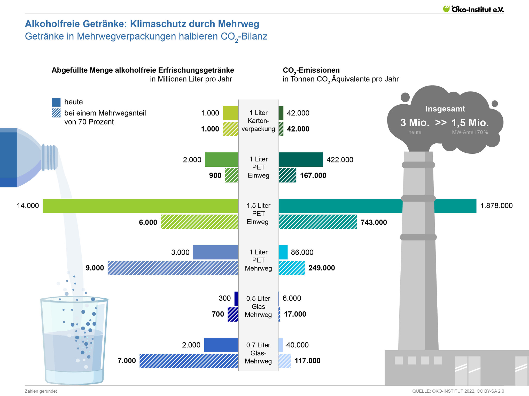 - Während Mehrweg-Glasflaschen ökologisch vorteilhaft sind, sind es Einweg-Glasflaschen nicht. Glas-Mehrwegflaschen schneiden aus Umweltschutzsicht deswegen so gut ab, weil sie bis zu 50-mal wiederbefüllt werden und so die Produktion von vielen Flaschen vermieden werden kann. Bei Einweg-Getränkeverpackungen schneiden der Getränkekarton und Schlauch- oder Standbodenbeutel vergleichsweise gut ab.