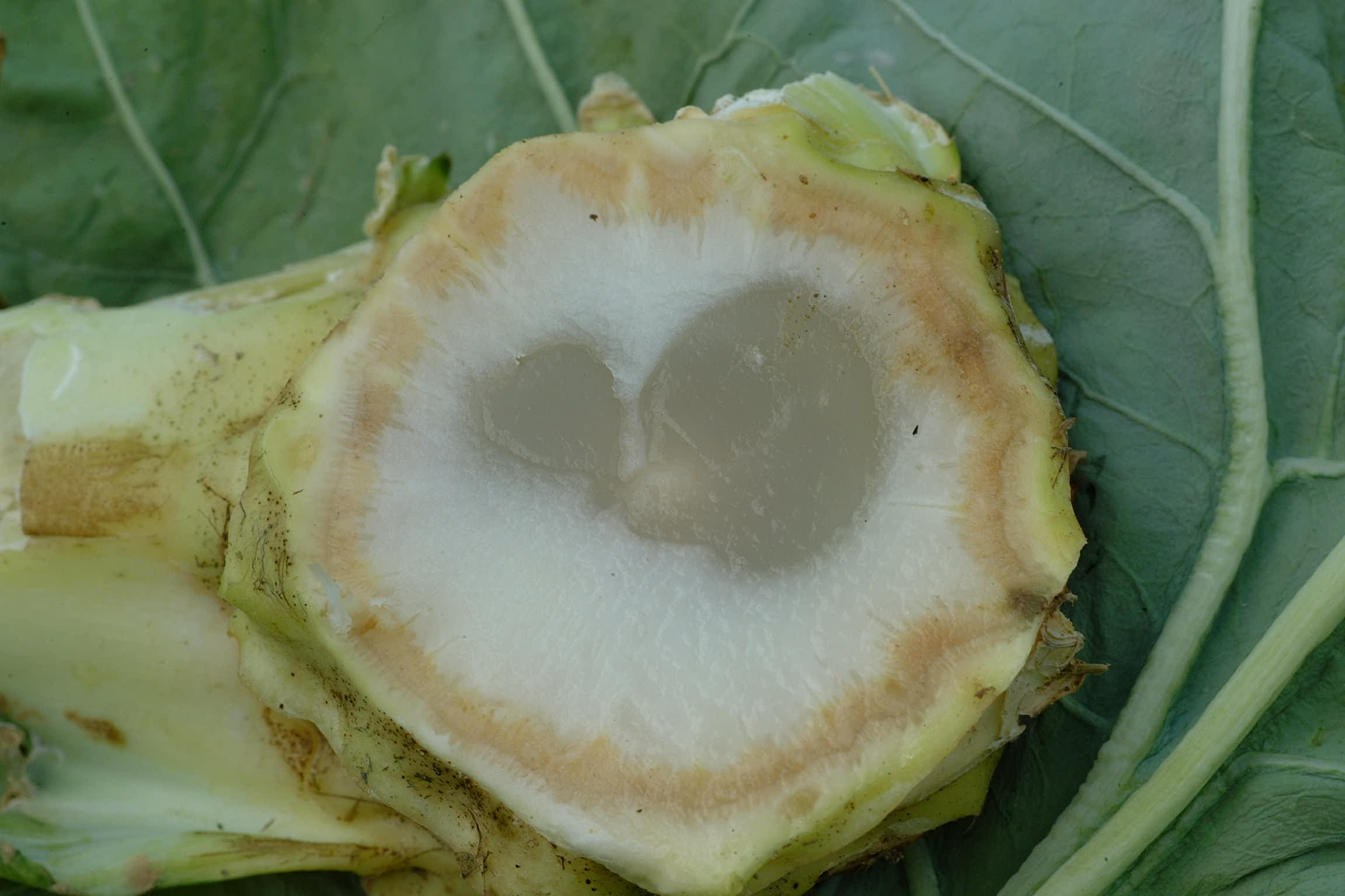 Krank durch Bakterienbefall: Weichfäule (Erwinia carotovora) am Kohlrabi Quelle: Schlaghecken DLR RP | http://www.greencommons.de/Datei:Strunkf%C3%A4ule-Erwinia-12-SLFA-JS.JPG | Erwinia Weichfäule Erwinia carotovora | http://creativecommons.org/licenses/by-nc-sa/3.0/de/