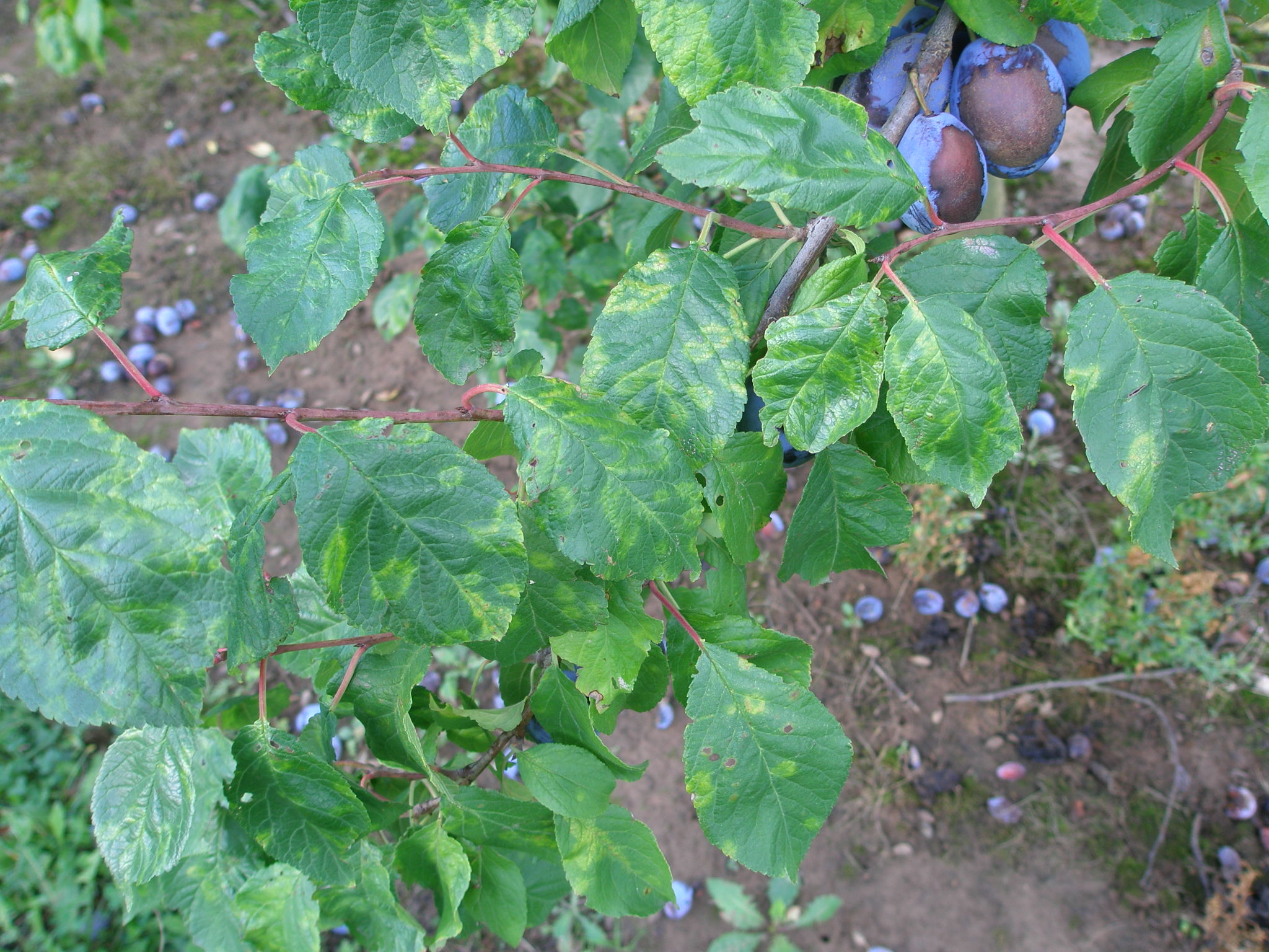 Scharka-Virus: Das Scharka-Virus (plum pox virus) tritt vorwiegend an Pflaumen auf, kann aber auch Aprikosen, Pfirsiche und Nektarinen treffen. Die befallenen Früchte sind pockenartig eingesunken oder verformt, die Blätter sind unregelmäßig aufgehellt. Das Fruchtfleisch der Pflaumen ist an einigen Stellen rötlich verfärbt, es ist gummiartig zäh und nahezu geschmacklos. Die Übertragung erfolgt durch Blattläuse, insbesondere durch die Grüne Pfirsichblattlaus (Myzus persicae).