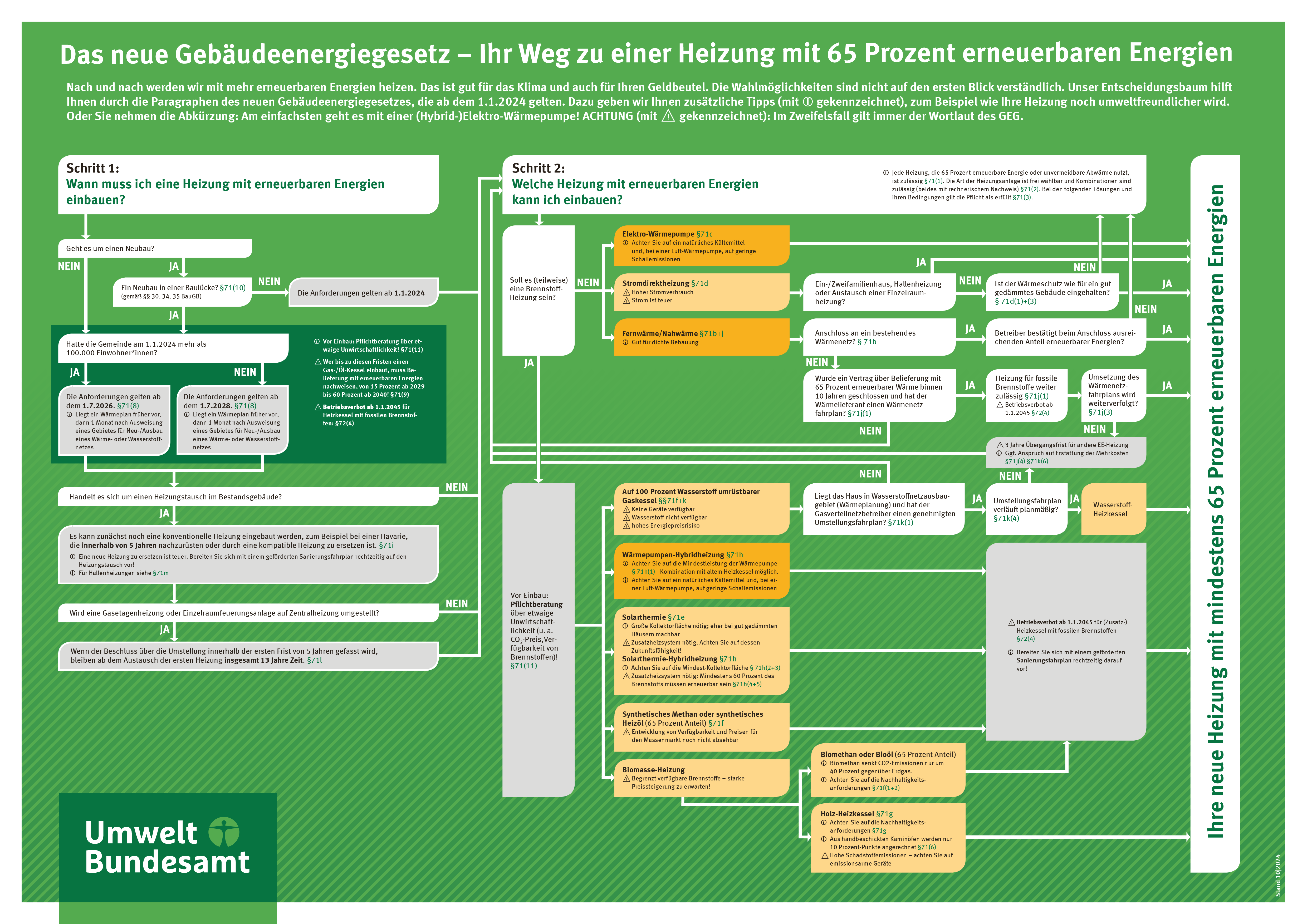 Nach und nach werden wir mit mehr erneuerbaren Energien heizen. Das ist gut für das Klima und auch für Ihren Geldbeutel. Unser Entscheidungsbaum hilft Ihnen durch die Paragraphen des neuen Gebäudeenergiegesetzes, die seit dem 1.1.2024 gelten. (Stand: 10/2024)
