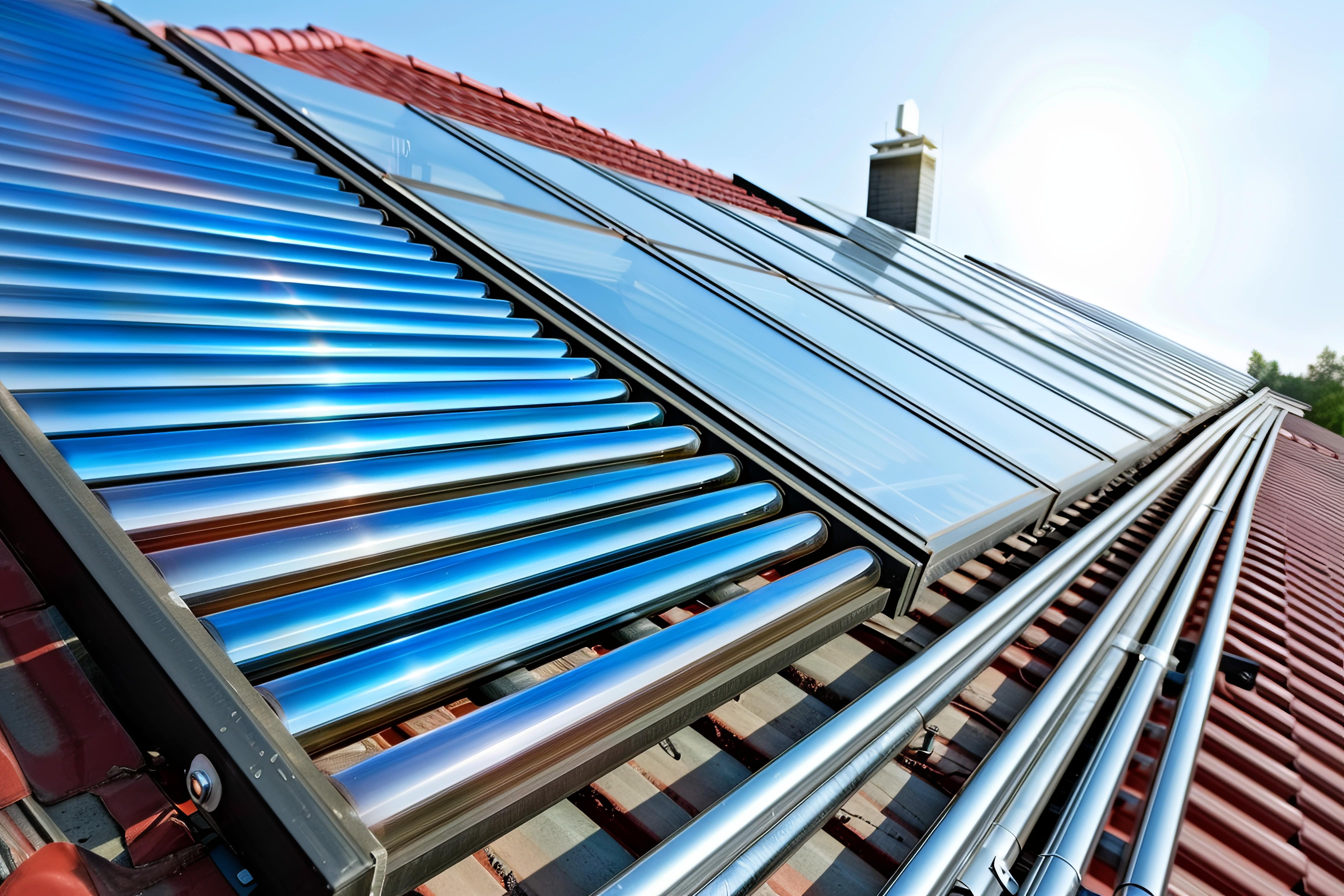 Solarthermie- und Photovoltaikmodule auf einem roten Ziegeldach. Die blauen Röhren der Solarthermieanlage reflektieren den blauen Himmel. Im Hintergrund sind ein Schornstein und die Baumkronen zu sehen.
