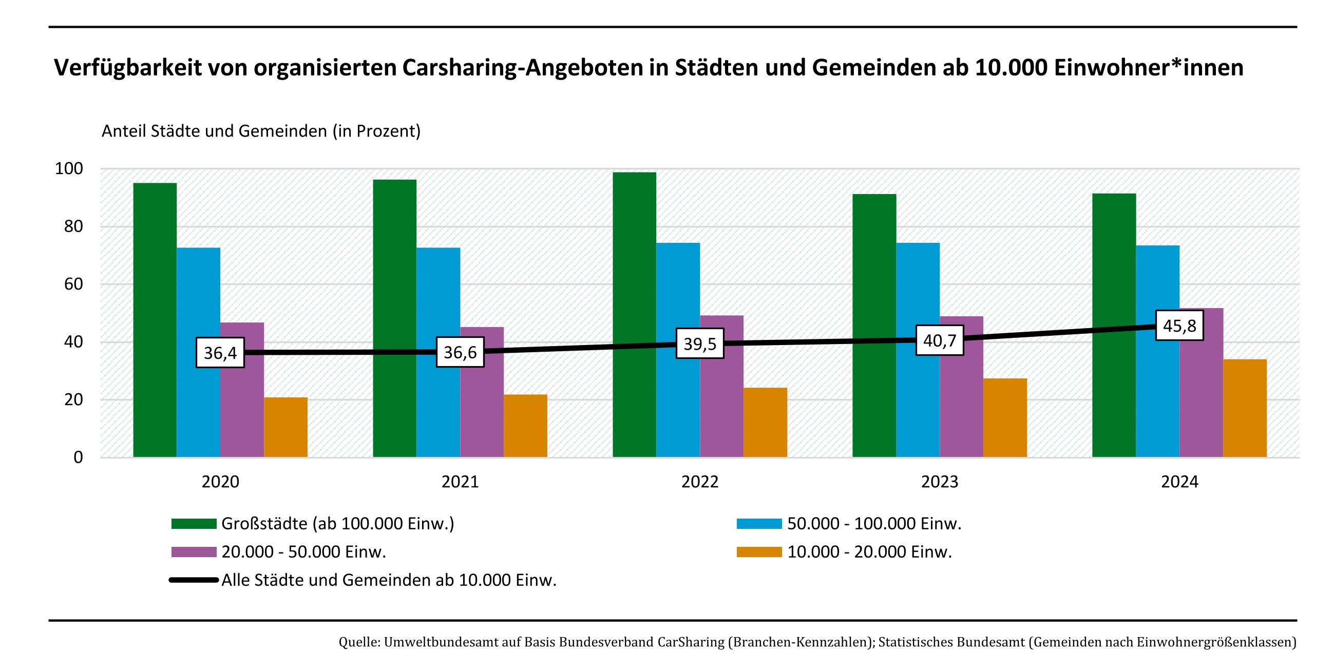 Die Abbildung zeigt den Anteil der Städte und Gemeinden ab einer Größe von 10.000 Einwohner*innen, in denen es mindestens ein organisiertes Carsharing-Angebot gibt. Dabei sind sowohl stationsbasierte als auch stationsunabhängige ("free-floating") Carsharing-Angebote erfasst, wobei es stationsunabhängige Angebote nur in Großstädten zusätzlich zu stationsbasierten Angeboten gibt.