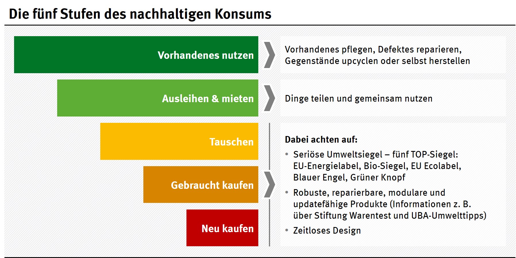 Häufig ist es einfacher, günstiger und ökologischer, Gegenstände, die nur selten verwendet werden, zu leihen oder zu mieten, anstatt zu kaufen. Dazu gehören beispielsweise Bohrmaschinen, Babyausstattung, Bücher und festliche Kleidung. Insbesondere innerhalb der Familie, im Freundes- und Kollegenkreis sowie in der Nachbarschaft ist das Leihen und Verleihen von Gegenständen häufig unkompliziert möglich. Auch hier gibt es Webseiten wie pumpipumpe, Tauschticket, nebenan.de und fainin, um Gegenstände aus privater Hand auszuleihen und zu verleihen. Zudem bieten viele kommerzielle Anbieter, wie Baumärkte, den Verleih von Elektro- und Elektronikgeräten an.