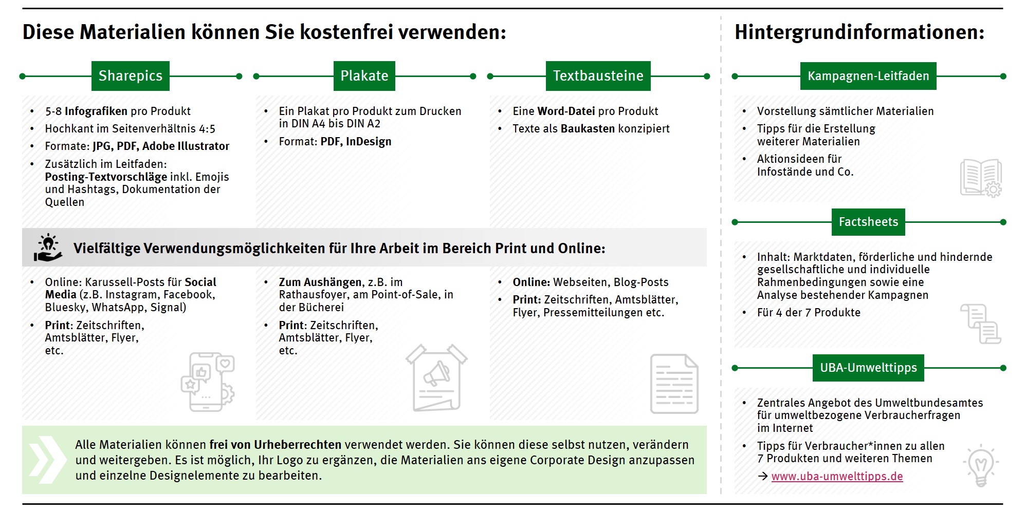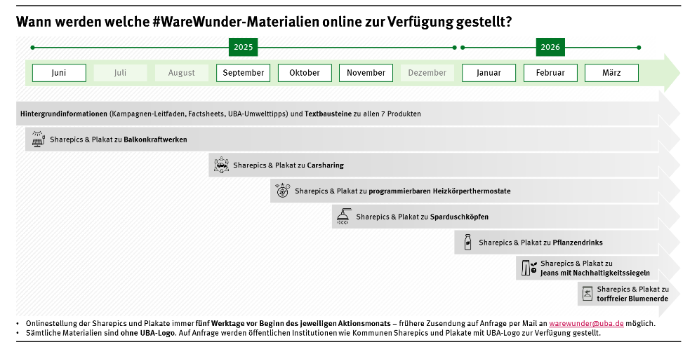 Sie sind an Druckfristen gebunden und benötigen die Sharepics zur Bebilderung Ihrer Artikel bereits früher? Kontaktieren Sie uns per E-Mail über warewunder@uba.de und wir senden Ihnen die Materialien vorab zu – verbunden mit der Bitte, diese erst im Aktionsmonat tatsächlich zu veröffentlichen.