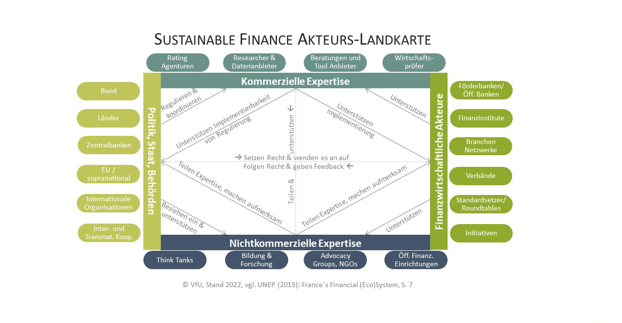 Mit Blick auf ihre Bedeutung für eine nachhaltige Orientierung des Finanzsektors sind Banken, Asset Manager (Vermögensverwalter), Institutionelle Investoren (wie Pensionsfonds) sowie Versicherungen und Wertpapierbörsen zu nennen. Aber auch Anlageberater sind Teil dieser Akteursgruppe.